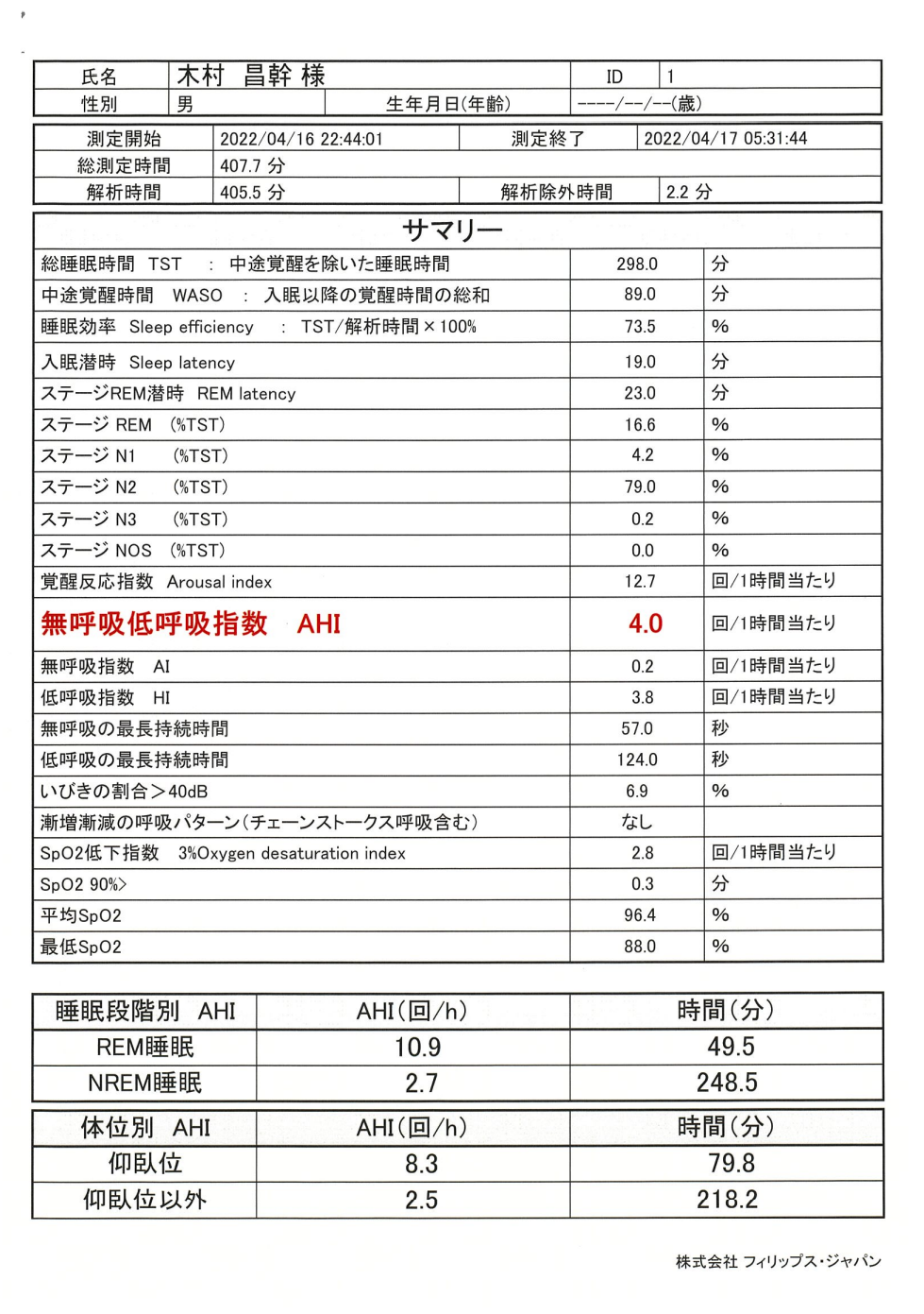 検査結果で重要なのはAHIです、AHIは「Apnea Hypopnea Index」の略で、日本語では無呼吸低呼吸指数といいます。1時間あたりの無呼吸(Apnea)と低呼吸(Hypopnea)を合わせた回数をいいます。
