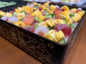 パラパラと巻き、大葉・ゴマを振っただけで豪華なちらし寿司になりました。![]()
