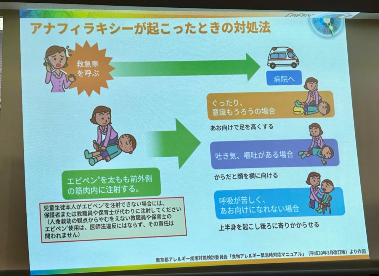 スタッフ全員で針無しエピペンを使って自分の太ももにうつ練習をしました。