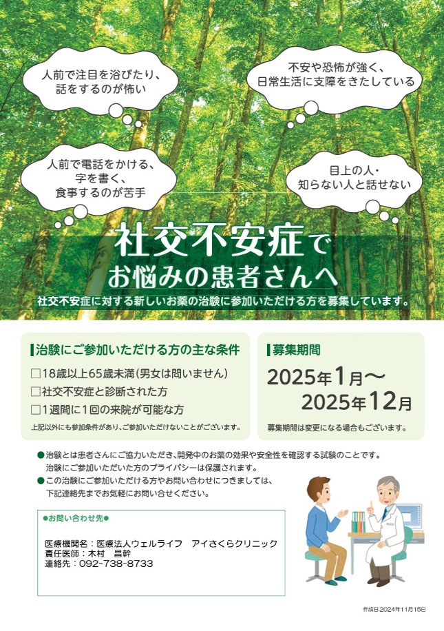 現在当院では 社交不安障害の治験を行っています 興味のある方はご相談下さい。