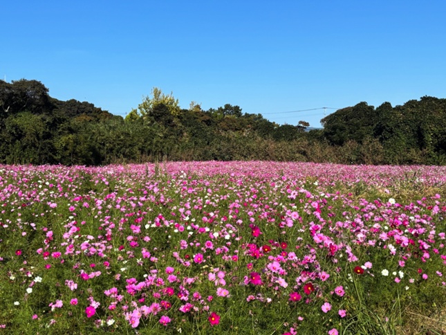 この写真の画角には入っていないのですが奥に海が見えており、青い空と海、ピンク色のコスモス畑がとても綺麗でした✨