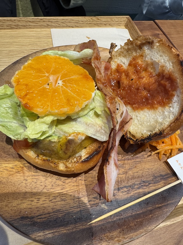 友人はBLMバーガーを注文しました!BLMとはBLTのトマト(T)をみかん(M)に変えているものです!!