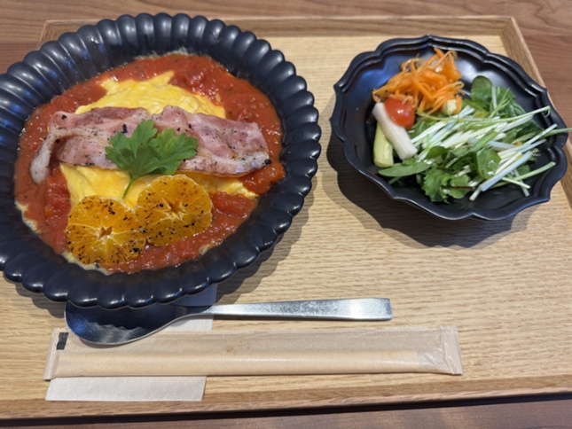 『みかんオムライス』最初メニューで見た時は名前の強さに驚きました😐「みかん3個分を使ったオムライスです」と記載が!