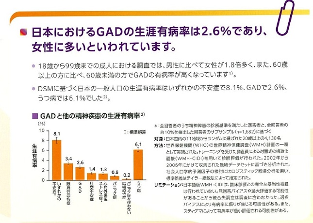 日本における全般不安症(GAD)の生涯有病率は2.6%であり、羅漢した経験のある方のうち、治療を受けたことのある方は3割ほどとのことです。