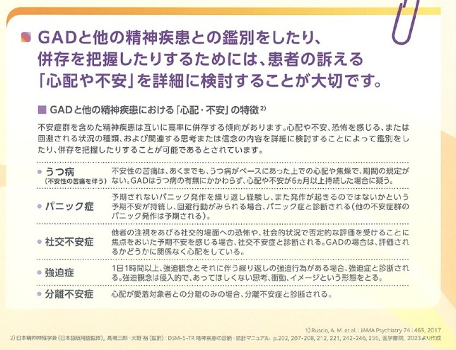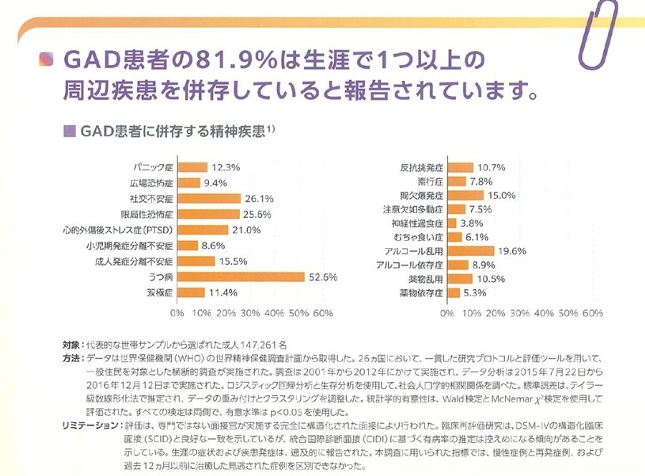 全般不安症(GAD)は、81.9%と多くの方がうつ病・社交不安症・限局性恐怖症などの疾患を併存していると報告されているようです。