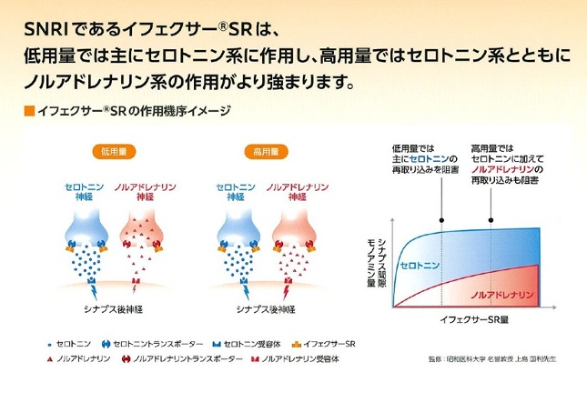 セロトニン・ノルアドレナリン再取り込み阻害剤(SNRI)のイフェクサーSRカプセル(ベンラファキシン塩酸塩徐放性カプセル)は低用量から主にセロトニン系に作用し、高用量ではセロトニン系とともにノルアドレナリン系の作用がより強まるとされています。