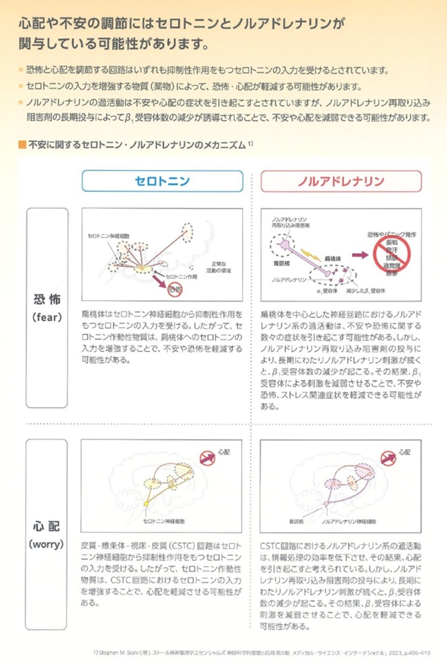 セロトニンの入力で恐怖と心配が軽減し、ノルアドレナリン再取り込み阻害剤の長期投与によって不安や心配を減弱できる可能性があります。