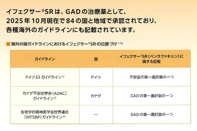イフェクサーSRは今までうつ病・うつ状態に有効なお薬でしたが、新たに全般不安症の効能または効果が追加されたということで、日本初の全般不安症(GAD)治療薬として適応追加されたました。