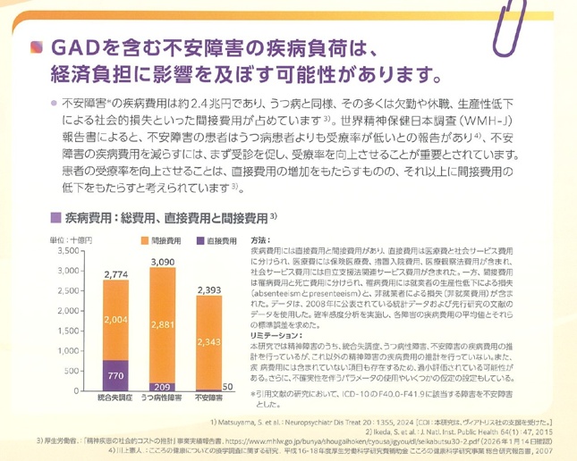 不安障害は、うつ病と同様に欠勤や休職で仕事のパフォーマンスが上がらないなど生産性低下による社会的損失があり、経済負担に影響を及ぼす可能性があると考えられています。