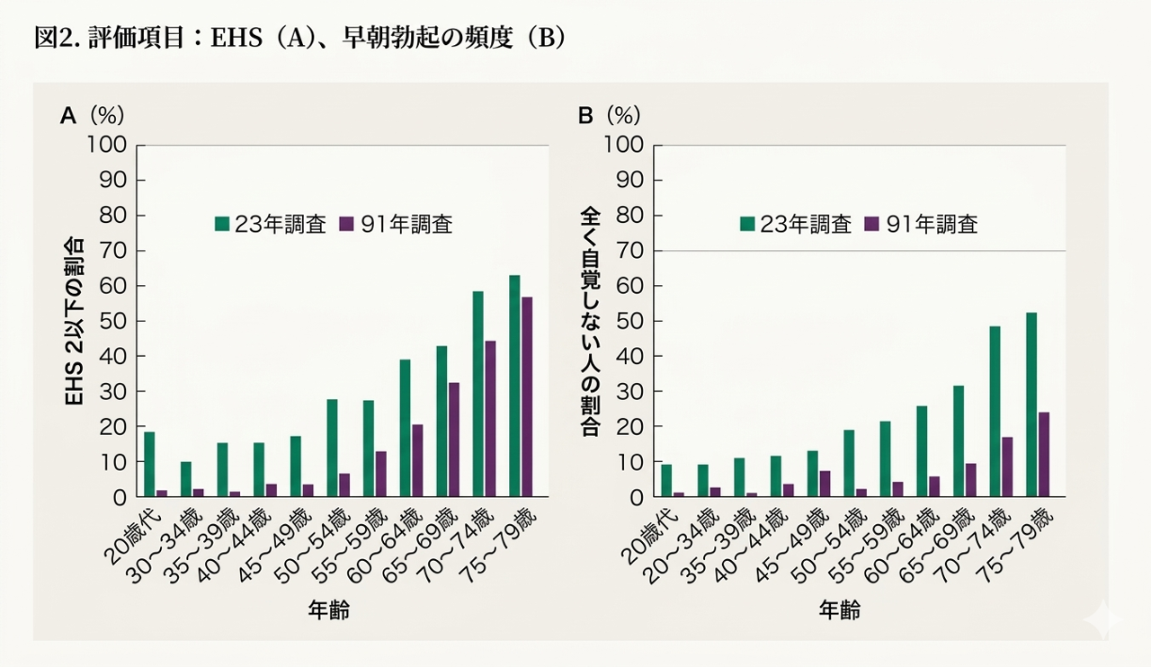 EHS(勃起の硬さスケールEHS2以下割合)は75~79歳を除く全ての年齢層で有意に低下しており、