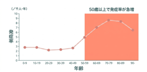 ※ピークは70代: グラフの頂点にあるように、70代で最も発症率が高くなります。