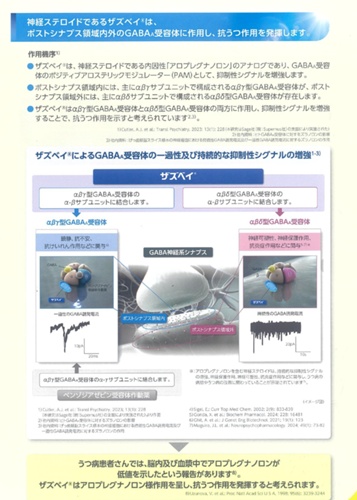 2026年3月19日、新規抗うつ薬ザズベイ(一般名:zuranolone ズラノロン)が国内承認・発売となりました。 本剤は神経ステロイド様作用を有するGABA_A受容体ポジティブ・アロステリック・モジュレーターであり(アロプレグナノロン様GABAa受容体機能賦活剤)、従来のSSRIやSNRIとは全く異なる作...